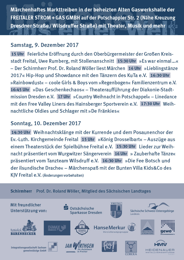 Am 09./10.12. sind der Potschappler Advent, der Kunst-Weihnachtsmarkt (im F1) und der Weihnachtsmarkt auf Schloss Burgk - wir beteiligen uns beim 1. und sind Projektträger beim 2.
